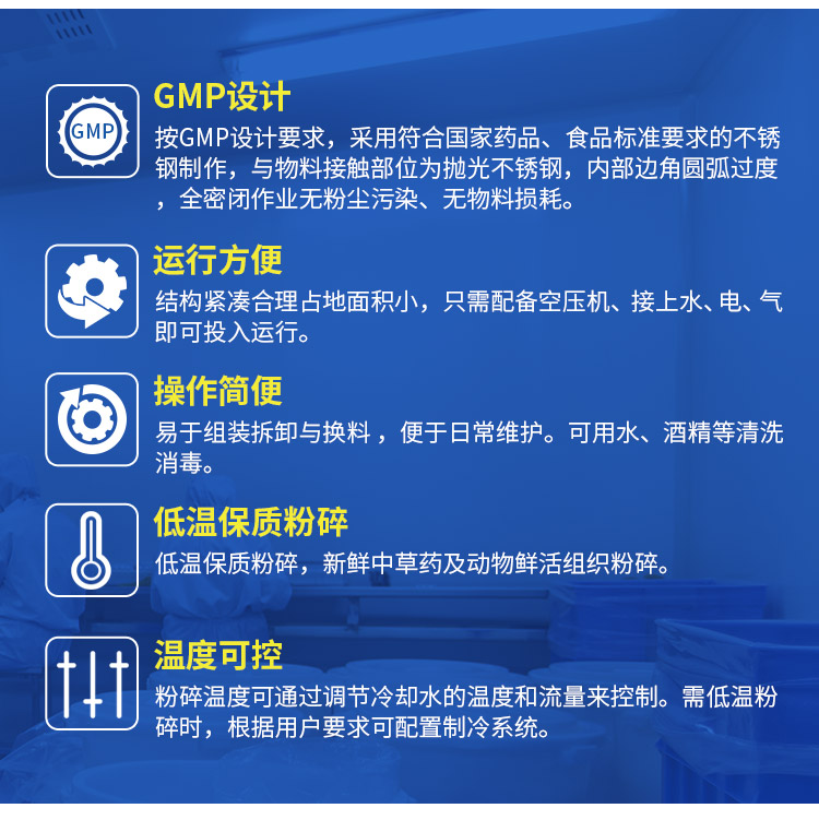 普萊申黃芪中藥超微粉碎機(jī)系列采用雙桶投料,全自動翻轉(zhuǎn)進(jìn)料,更省心省力,負(fù)壓密封設(shè)計(jì),噪音低,干凈安全。同時采用低溫粉碎技術(shù),保存了物料活性成分,機(jī)器采用一體化設(shè)計(jì),節(jié)省空間,更節(jié)能,研磨粉碎方式,可連續(xù)工作16小時。目前采用的是先進(jìn)的數(shù)控屏幕,操作清晰便捷,操作過程效率高,耗能低,不易損壞。